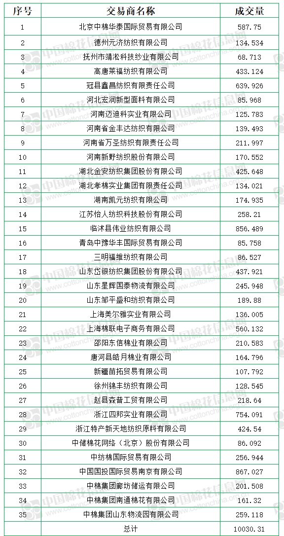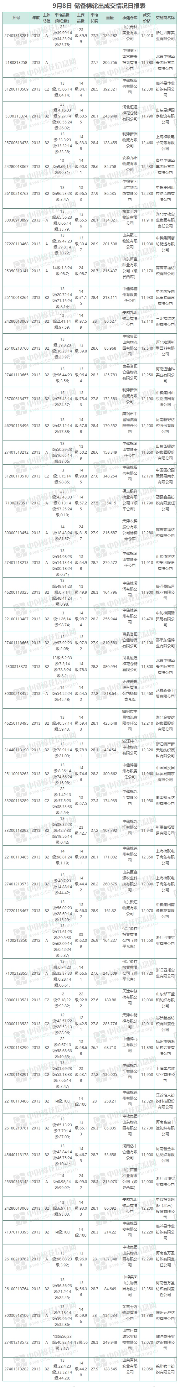 中國(guó)儲(chǔ)備棉管理有限公司定于9月8日上市銷售儲(chǔ)備棉重量10030.31噸,實(shí)際成交10030.31噸,成交率100%,成交均價(jià)12085元/噸,較7日下跌10元/噸,折3128價(jià)格13425元/噸,較7日上漲214元/噸。