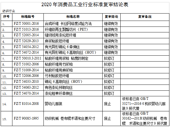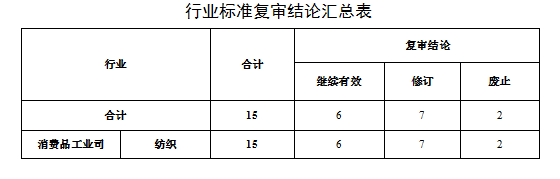 經(jīng)相關(guān)行業(yè)協(xié)會(huì)、標(biāo)準(zhǔn)化技術(shù)組織的評(píng)審,現(xiàn)已確定15項(xiàng)行業(yè)標(biāo)準(zhǔn)復(fù)審結(jié)論,其中繼續(xù)有效6項(xiàng),擬修訂7項(xiàng),擬廢止2項(xiàng)?,F(xiàn)予公示,如有異議,請(qǐng)于10月14日前向工業(yè)和信息化部科技司反饋,電子郵件發(fā)送至KJBZ@miit.gov.cn(郵件主題注明:行業(yè)標(biāo)準(zhǔn)復(fù)審公示反饋)。