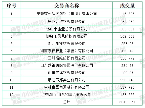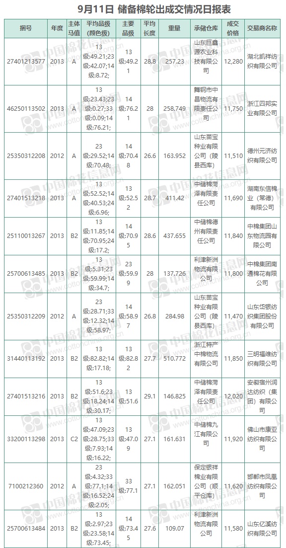 中國(guó)儲(chǔ)備棉管理有限公司定于9月11日上市銷售儲(chǔ)備棉重量3042.061噸,實(shí)際成交3042.061噸,成交率100%,成交均價(jià)11789元/噸,較10日下跌97元/噸,折3128價(jià)格13079元/噸,較10日上漲16元/噸。