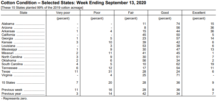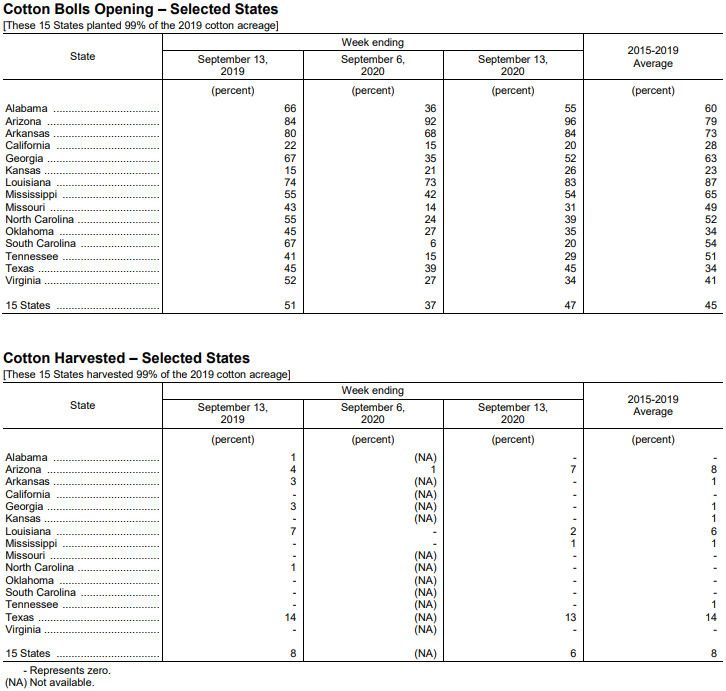 美國農(nóng)業(yè)部9月14日發(fā)布的美國棉花生產(chǎn)報告顯示,截至9月13日當周,美棉吐絮進度為47%,前周為37%,去年同期為51%,5年均值為45%。美棉收獲進度為6%,去年同期為8%,5年均值為8%。美棉優(yōu)良率為45%,前周為45%,去年同期為41%。