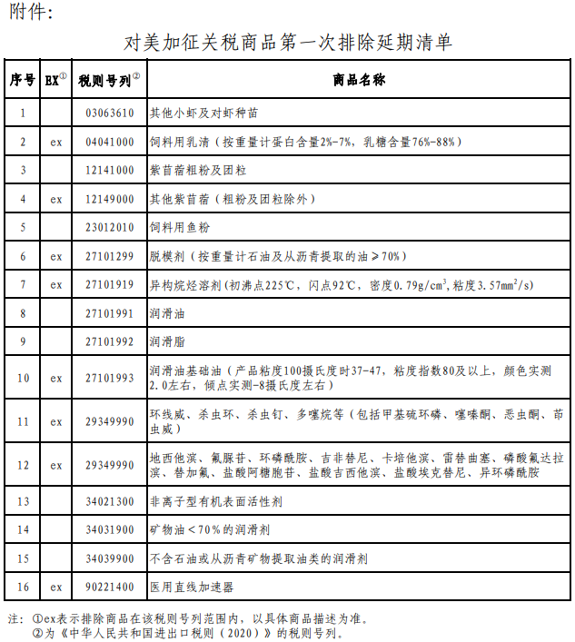 對附件所列16項(xiàng)商品,稅委會公告〔2019〕6號規(guī)定的排除期限延長一年,即自2020年9月17日至2021年9月16日,繼續(xù)不加征我為反制美301措施所加征的關(guān)稅。