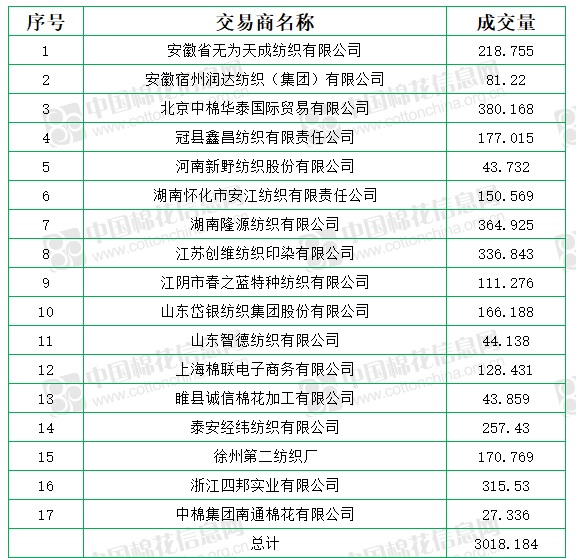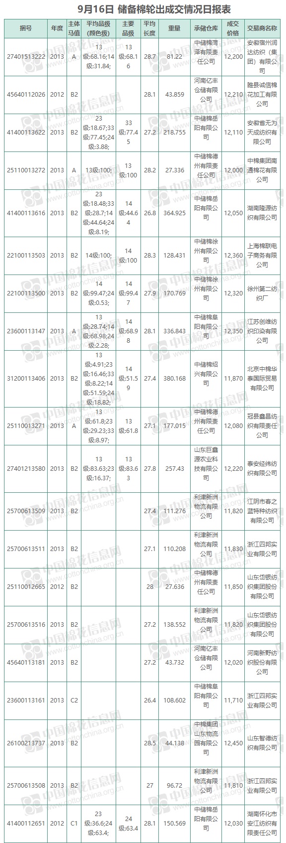 中國(guó)儲(chǔ)備棉管理有限公司定于9月16日上市銷售儲(chǔ)備棉重量3018.184噸,實(shí)際成交3018.184噸,成交率100%,成交均價(jià)12071元/噸,較15日下跌60元/噸,折3128價(jià)格13866元/噸,較15日上漲334元/噸。