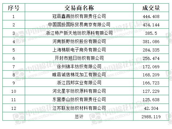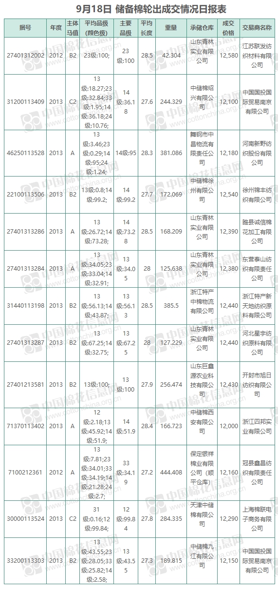中國儲備棉管理有限公司定于9月18日上市銷售儲備棉重量2988.119噸,實際成交2988.119噸,成交率100%,成交均價12282元/噸,較17日上漲151元/噸,折3128價格13486元/噸,較17日下跌100元/噸。