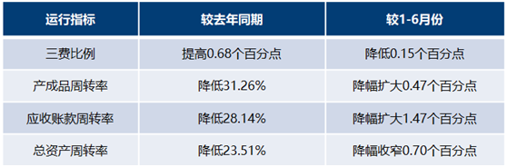 1-7月規(guī)模以上印染企業(yè)三費(fèi)比例7.38%,同比提高0.68個(gè)百分點(diǎn),其中棉印染企業(yè)為7.07%,化纖印染企業(yè)為9.64%。產(chǎn)成品周轉(zhuǎn)率8.73次/年,同比降低31.26%;應(yīng)收賬款周轉(zhuǎn)率4.21次/年,同比降低28.14%;總資產(chǎn)周轉(zhuǎn)率0.49次/年,同比降低23.51%。環(huán)比來(lái)看,1-7月企業(yè)三費(fèi)比例降低0.15個(gè)百分點(diǎn),產(chǎn)成品周轉(zhuǎn)率降幅擴(kuò)大0.47個(gè)百分點(diǎn),應(yīng)收賬款周轉(zhuǎn)率降幅擴(kuò)大1.47個(gè)百分點(diǎn),總資產(chǎn)周轉(zhuǎn)率降幅小幅收窄0.70個(gè)百分點(diǎn),表明行業(yè)企業(yè)當(dāng)前所面臨資金壓力仍較大,企業(yè)運(yùn)營(yíng)壓力尚未得到有效緩解。