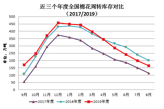 8月紡織市場(chǎng)有所回暖,企業(yè)積極競(jìng)拍儲(chǔ)備棉,成交價(jià)持續(xù)上漲。月末國(guó)內(nèi)棉花周轉(zhuǎn)庫(kù)存再次下降。據(jù)中國(guó)棉花協(xié)會(huì)棉花物流分會(huì)對(duì)全國(guó)棉花交易市場(chǎng)18個(gè)省市的154家棉花交割和監(jiān)管倉(cāng)庫(kù)的調(diào)查數(shù)據(jù)顯示,8月底全國(guó)周轉(zhuǎn)庫(kù)存總量約164.96萬(wàn)噸,低于去年同期35.9萬(wàn)噸;較上月減少34.21萬(wàn)噸,降幅17.18%。