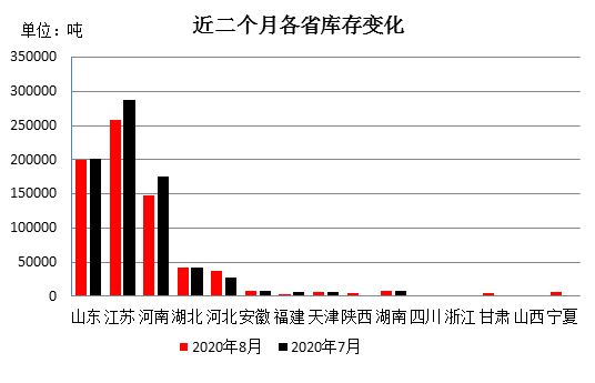 從庫(kù)存量變化情況看,各省份庫(kù)存多減少增。其中降幅最大的是江蘇省,較上月減少2.85萬(wàn)噸;其次是河南省,較上月減少2.69萬(wàn)噸;山東省減少0.29萬(wàn)噸;福建省下降0.21萬(wàn)噸;庫(kù)存量增加的省份為河北增加0.93萬(wàn)噸;寧夏增加0.59萬(wàn)噸;甘肅增加0.41萬(wàn)噸;陜西增加0.40;其他省份波動(dòng)幅度在0.1萬(wàn)噸以下。
