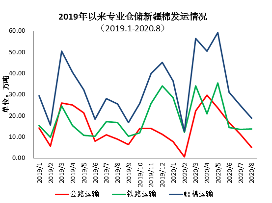2019年度(2019年9月-2020年8月)出疆棉公路與鐵路共發(fā)運(yùn)417.28萬(wàn)噸,同比增加99.42萬(wàn)噸。