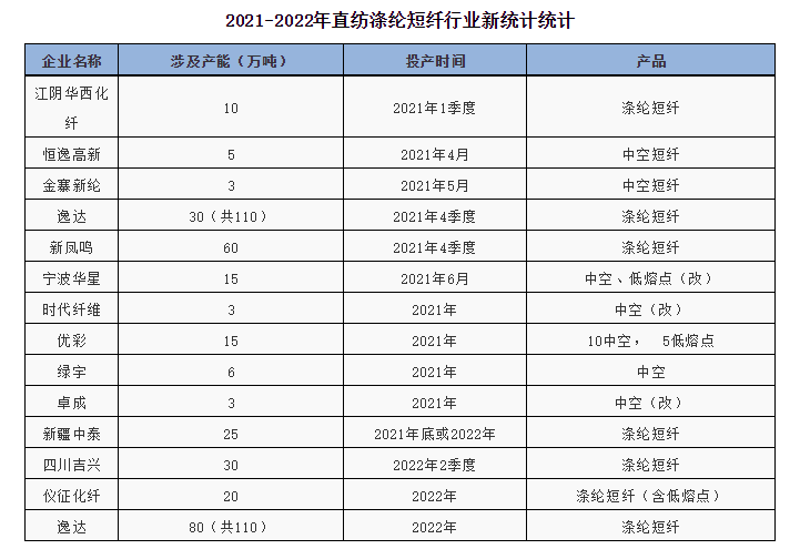 ②2021年看,前3季度僅有華西1套10萬(wàn)噸滌綸短纖產(chǎn)能待投產(chǎn),其余產(chǎn)能多以中空、低熔點(diǎn)差異化品種為主,常規(guī)紡紗產(chǎn)能再無(wú)其他,所以預(yù)計(jì)2021年前3季度行業(yè)總體供應(yīng)壓力依舊不大。但2021年4季度開始,行業(yè)新增產(chǎn)能較多,包括恒逸、新鳳鳴等在內(nèi)多家巨型企業(yè)皆有滌綸短纖項(xiàng)目投產(chǎn)規(guī)劃,更有其他幾家煉化一體化企業(yè)存在滌綸短纖項(xiàng)目投產(chǎn)可能,故預(yù)計(jì)2022年后滌綸短纖行業(yè)供應(yīng)壓力將逐步加大。具體投產(chǎn)明細(xì)如下: