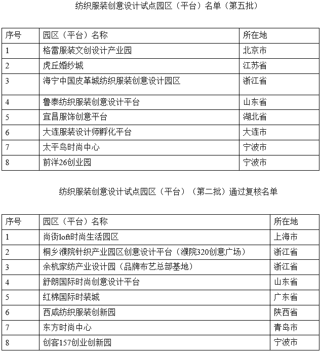 根據(jù)《工業(yè)和信息化部關(guān)于印發(fā)<紡織服裝創(chuàng)意設(shè)計試點示范園區(qū)(平臺)管理辦法(試行)>的通知》(工信部消費〔2016〕396號)要求,經(jīng)園區(qū)(平臺)自愿申報、省級工業(yè)和信息化主管部門推薦、專家評審和網(wǎng)上公示等程序,確定紡織服裝創(chuàng)意設(shè)計試點園區(qū)(平臺)名單(第五批)和紡織服裝創(chuàng)意設(shè)計試點園區(qū)(平臺)(第二批)通過復(fù)核名單?,F(xiàn)予公告。