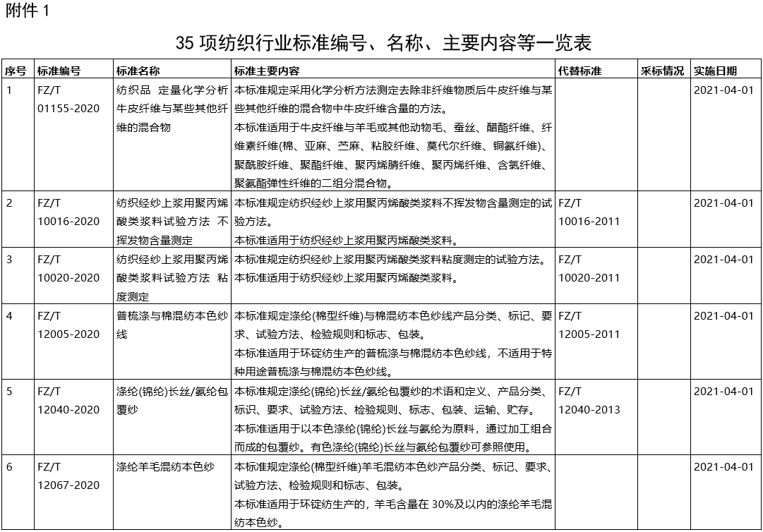 12月9日工業(yè)和信息化部批準35項紡織行業(yè)標準(標準編號、名稱、主要內容及實施日期見附件1);批準12項紡織行業(yè)計量技術規(guī)范(技術規(guī)范編號、名稱、主要內容及實施日期見附件4),現予公布。