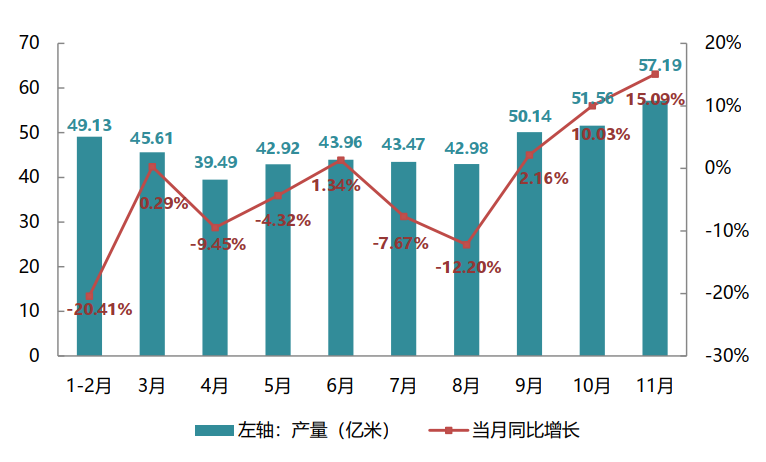 據(jù)國家統(tǒng)計(jì)局?jǐn)?shù)據(jù),1-11月規(guī)模以上印染企業(yè)印染布產(chǎn)量463.53億米,同比減少7.21%,產(chǎn)量降幅較1-10月收窄1.65個(gè)百分點(diǎn),生產(chǎn)呈現(xiàn)持續(xù)修復(fù)態(tài)勢(shì)。9月以來,印染布當(dāng)月產(chǎn)量均維持在50億米以上,連續(xù)3個(gè)月保持正增長,同比增速分別2.16%、10.03%、15.09%。