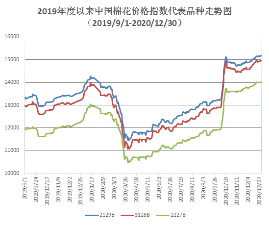 12月,國內(nèi)新棉收購及加工工作持續(xù)開展,市場新棉資源量繼續(xù)增加,陳棉消耗即將殆盡,新棉成為市場銷售資源主體,國內(nèi)棉花市場資源量充裕。月內(nèi)紡織訂單旺盛,需求大增,國內(nèi)棉花現(xiàn)貨價格繼續(xù)上漲,并創(chuàng)年度新高。月末,中國棉花價格指數(shù)(CCIndex3128B)14963元/噸,較上月末上漲312元;月均價14793元/噸,環(huán)比上漲260元,同比上漲1639元。