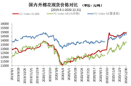 12月,國內(nèi)棉花收購、加工接近完成,新棉加工量持續(xù)增長,市場資源量充裕,紡織行業(yè)下游需求好轉(zhuǎn),對棉花原料補庫需求和采購熱情持續(xù)升溫,國內(nèi)棉花價格延續(xù)上漲,成品紗線及粘膠和化纖等產(chǎn)品價格也均有不同程度上漲。同期,國際棉價震蕩上漲,但漲幅低于國內(nèi)棉花現(xiàn)貨,1%關(guān)稅下外棉現(xiàn)貨價格仍低于國內(nèi)棉花現(xiàn)貨價格。