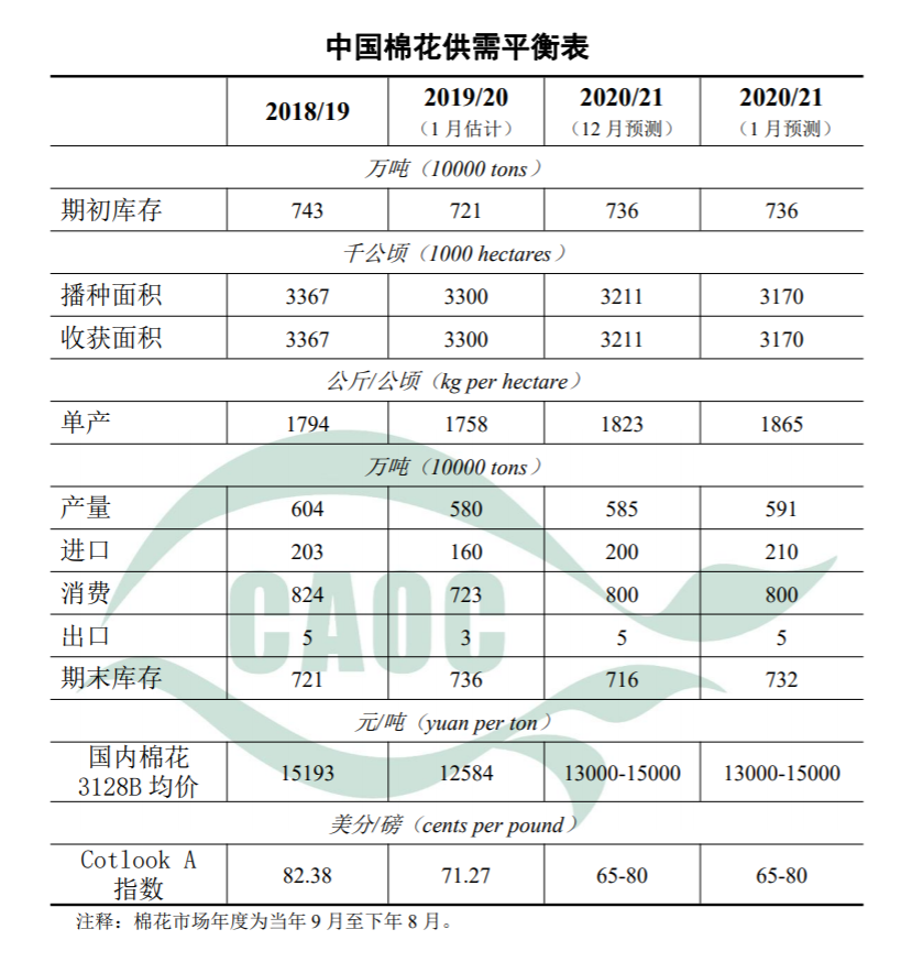 2020/21年度中國棉花收購、加工基本結(jié)束,銷售進(jìn)度快于往年。據(jù)全國棉花交易市場數(shù)據(jù),截至1月10日,新疆地區(qū)皮棉累計加工總量518萬噸,其中自治區(qū)318萬噸、兵團(tuán)200萬噸。據(jù)國家統(tǒng)計局?jǐn)?shù)據(jù),2020/21年度中國棉花播種面積3170千公頃,單產(chǎn)每公頃1865公斤,總產(chǎn)量591萬噸。本月預(yù)測,2020/21年度棉花產(chǎn)量上調(diào)6萬噸,消費維持上月預(yù)測數(shù)不變。在國內(nèi)消費持續(xù)向好、人民幣匯率走勢偏強等因素影響下,新年度前3個月中國累計進(jìn)口棉花62萬噸,比上年同期增加135%,考慮到自2021年1月1日起棉花配額外進(jìn)口部分的滑準(zhǔn)稅稅率下調(diào),內(nèi)外棉價差較大,上調(diào)棉花進(jìn)口10萬噸至210萬噸,期末庫存增至732萬噸。全球棉花供需仍保持寬松格局,棉花平均價格預(yù)測區(qū)間暫不作調(diào)整。