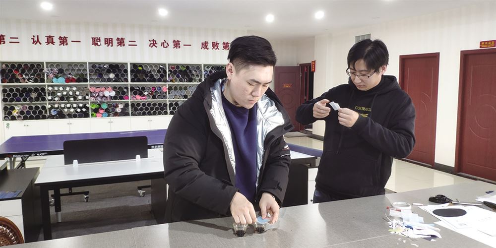 圖1為纖而紡織研發(fā)部負(fù)責(zé)人劉之銘(左)進(jìn)行面料除臭試驗(yàn)。