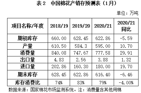 基于相關(guān)專題調(diào)查和對國內(nèi)外經(jīng)濟環(huán)境及市場狀況的分析,2021年1月國家棉花市場監(jiān)測系統(tǒng)對國內(nèi)棉花產(chǎn)銷存預(yù)測如下:2020/21年度我國棉花產(chǎn)量595萬噸,同比增加10.7萬噸,同比增幅1.83%;消費量777.58萬噸,同比增加29.91萬噸,同比增幅4%;期末庫存616.4萬噸,同比減少6.46萬噸,同比減幅1%;產(chǎn)需缺口182.58萬噸,較上年度擴大19.21萬噸,庫存消費比為79%,較上年下降4個百分點。