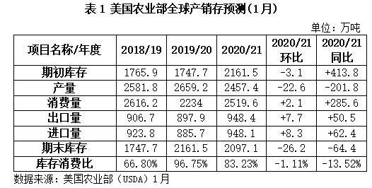 美國農(nóng)業(yè)部(USDA)2021年1月發(fā)布的數(shù)據(jù)顯示,2020/21年度全球棉花期初庫存2161.5萬噸,較上月調(diào)減3.1萬噸,同比增加413.8萬噸,同比增幅23.6%,處近5年來最高值;產(chǎn)量2457.4萬噸,環(huán)比調(diào)減22.6萬噸,同比減少201.8萬噸,同比減幅7.6%;消費2519.6萬噸,環(huán)比調(diào)增2.1萬噸,同比增加285.6萬噸,同比增幅12.8%,較疫情前的2018年度消費量下降3.7%;期末庫存2097.1萬噸,較上月調(diào)減26.2萬噸,同比減少64.4萬噸,同比減幅2.9%;全球庫存消費比為83.23%,環(huán)比調(diào)減1.11個百分點,同比下降13.52個百分點;全球產(chǎn)需狀況由2019/20年度的產(chǎn)大于需425.2萬噸,轉(zhuǎn)為2020/21年度的產(chǎn)不足需62.2萬噸。