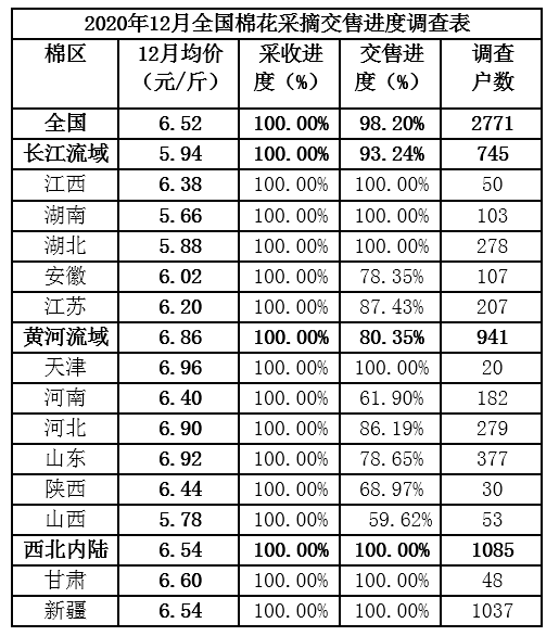 中國棉花協(xié)會棉農分會對內地12個省市和新疆自治區(qū),2771個定點農戶進行棉花交售情況的調查,調查結果顯示:全國棉花采摘全部結束,交售進度略慢于去年同期,其中新疆交售已結束,內地仍有部分存棉未出售,截至12月底全國棉花交售進度為98.20%,同比低0.35個百分點。