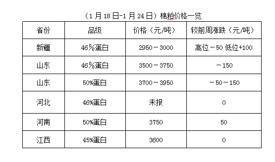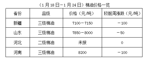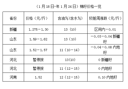 上周(1月18-24日),期貨豆油、豆粕全線走弱,且豆粕跌勢加劇,拖累油棉行情,棉籽、棉副滯漲回落,油棉虧損加劇,加之環(huán)保預(yù)警,山東部分地區(qū)停機,市場購銷減量,春節(jié)放假時間即將到來,個別油棉廠已做好放假準(zhǔn)備,油棉市場維持震蕩調(diào)整。