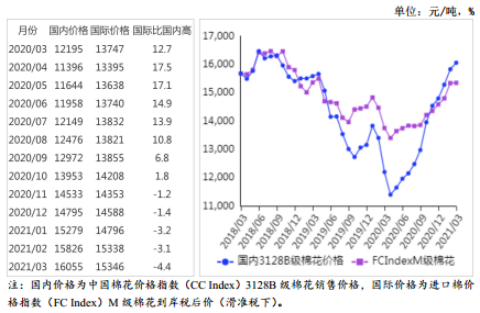 (一)國內(nèi)棉價(jià)繼續(xù)上漲。3月紡織行業(yè)供求基本面運(yùn)行格局未發(fā)生明顯變化,需求保持回暖態(tài)勢(shì),部分企業(yè)訂單排到5月以后,帶動(dòng)棉價(jià)繼續(xù)上漲。棉花期貨價(jià)格受外圍不利因素影響持續(xù)下行,3月2日-26日鄭棉期貨主力合約(CF105)從每噸16540元下降到14535元,降幅11.3%。3月國內(nèi)3128B級(jí)棉花月均價(jià)每噸16055元,環(huán)比漲1.4%,同比漲31.7%。鄭棉5月期貨主力合約月結(jié)算價(jià)每噸15700元,環(huán)比跌1.2%,同比漲36.4%。