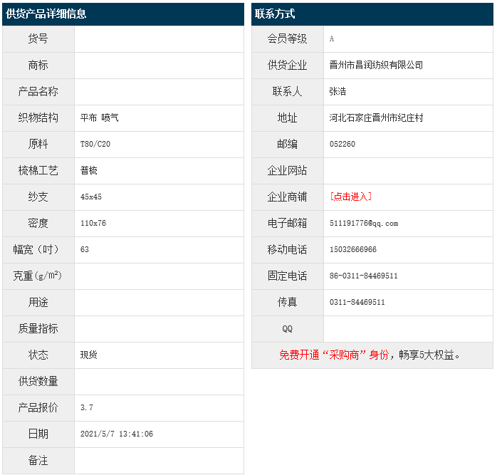 5月7日,晉州昌潤紡織有限公司滌棉平布T80/C20 45x45 110x76 63" 噴氣,報價為3.7元/米,實際成交價以協(xié)商為準(zhǔn)。[點(diǎn)擊查看詳情]