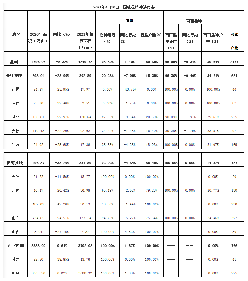2021年4月底,中國棉花協(xié)會棉農(nóng)分會對全國12個省市和新疆自治區(qū)2157個定點農(nóng)戶進行植棉意向及棉花播種進度的調(diào)查,調(diào)查結(jié)果顯示:2021年度全國植棉面積為4349.7萬畝,同比下降5.38%,較上期調(diào)查減少17.82萬畝,降幅較上期擴大0.39個百分點。其中:新疆地區(qū)植棉面積3688.3萬畝,占全國總面積的84.8%,同比增長0.62%,漲幅與上期基本持平;內(nèi)地植棉面積繼續(xù)下降,其中黃河流域植棉面積331.9萬畝,同比下降33.20%,降幅較上期擴大4.4個百分點;長江流域植棉面積302.9萬畝,同比下降23.90%,降幅較上期縮小3.13個百分點。