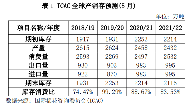 國際棉花咨詢委員會(ICAC)發(fā)布2021/22年度全球棉花產(chǎn)銷存預(yù)測數(shù)據(jù)顯示,2021/22年度全球棉花產(chǎn)量2432萬噸,同比減少26萬噸,減幅1.06%;消費量2532萬噸,同比增加35萬噸,增幅1.40%;期末庫存2115萬噸,同比減少99萬噸,減幅4.47%;全球產(chǎn)需狀況由2020/21年度的產(chǎn)不足需39萬噸擴大到2021/22年度的100萬噸;2021/22年度全球庫存消費比為83.53%,較2021/22年的88.67%下降5.14個百分點,庫存消費比年度降速有所放緩。