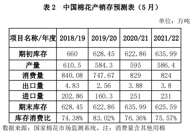 基于相關(guān)專題調(diào)查和對國內(nèi)外經(jīng)濟環(huán)境及市場狀況的分析,2021年5月,國家棉花市場監(jiān)測系統(tǒng)對2021/22年度國內(nèi)棉花產(chǎn)銷存預(yù)測如下:2021/22年度我國棉花產(chǎn)量586.4萬噸,同比減少8.6萬噸,減幅1.45%;消費量824萬噸,同比減少5萬噸,減幅0.6%;期末庫存625.59萬噸,同比減少10.4萬噸,減幅1.64%;產(chǎn)需缺口237.6萬噸,較2020/21年度擴大3.6萬噸,庫存消費比為75.57%,較2020/21年度下降0.79個百分點。