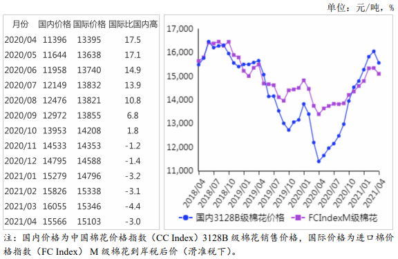 (一)國內棉價環(huán)比下跌。本月上旬,受前期新疆棉事件影響,下游紡織市場觀望情緒較濃,新訂單跟進不足,國內棉價弱勢振蕩。中下旬,國家統(tǒng)計局公布1季度國內生產(chǎn)總值同比增18.3%,創(chuàng)近30年單季同比增長最高水平,市場情緒有所提振,國內棉價反彈回升,但下游紡織生產(chǎn)處于換季階段,企業(yè)原料采購需求仍顯平淡。4月國內3128B級棉花月均價每噸15566元,環(huán)比跌3.0%,同比漲36.6%。鄭棉期貨主力合約(CF109)月結算價每噸15250元,環(huán)比跌2.9%,同比漲31.6%。