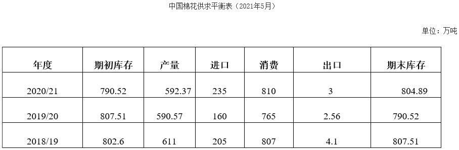 4月,紡織市場銷售順暢,企業(yè)訂單充足,整體開工率較高,原料庫存進(jìn)一步消耗,商業(yè)庫存持續(xù)下降。受印度疫情及大宗商品價(jià)格上漲等多因素影響,國內(nèi)棉價(jià)月末收漲,內(nèi)外棉價(jià)差縮小。據(jù)中國棉花協(xié)會調(diào)查,2021年度全國植棉面積同比下降,播種進(jìn)度已過9成快于去年同期。月末,為保障紡織企業(yè)用棉需求,國家發(fā)放棉花進(jìn)口滑準(zhǔn)稅配額70萬噸,全部為非國營貿(mào)易配額。中國棉花協(xié)會預(yù)計(jì),2020/21年度棉花消費(fèi)量為810萬噸,同比增長5.9%;進(jìn)口量為235萬噸,同比增長46.9%;期末庫存約為805萬噸,同比增長1.8%;產(chǎn)量為592萬噸,同比持平略增。