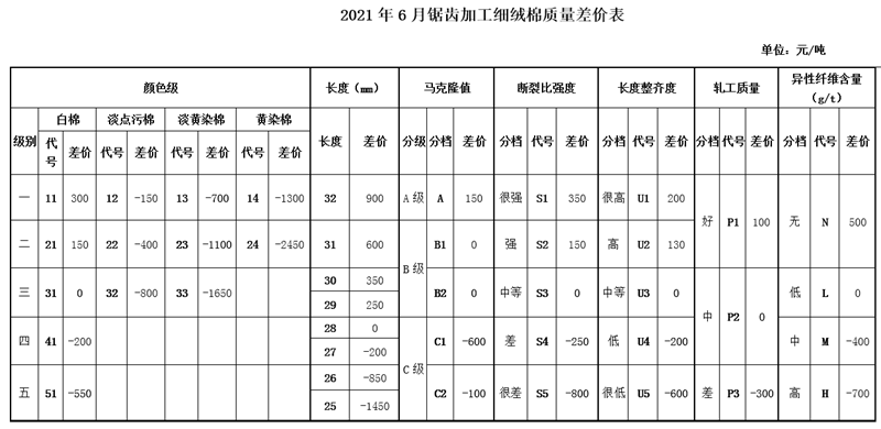 根據(jù)《中國棉花協(xié)會國產(chǎn)棉質(zhì)量差價(jià)表管理辦法》規(guī)定,現(xiàn)正式發(fā)布2021年6月《鋸齒加工細(xì)絨棉質(zhì)量差價(jià)表》、《皮輥加工細(xì)絨棉質(zhì)量差價(jià)表》和《長絨棉質(zhì)量差價(jià)表》(單位:元/噸)。