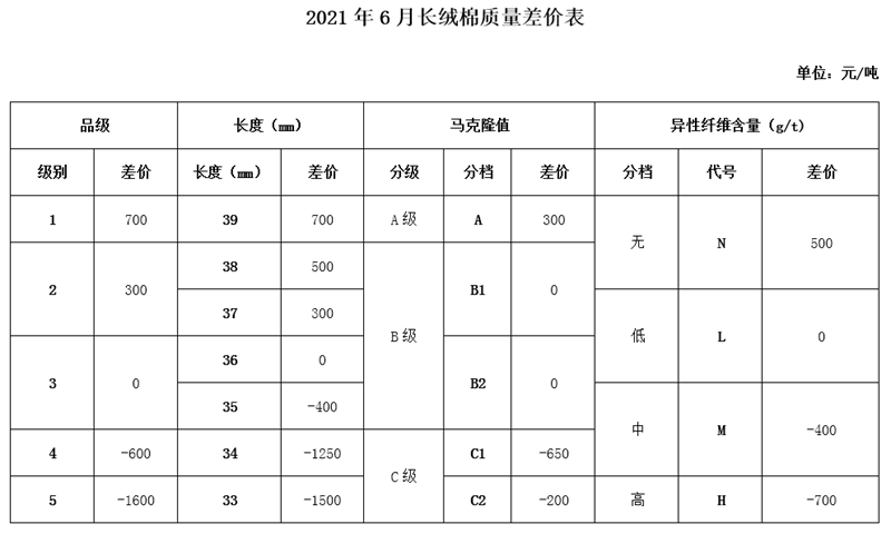 依據(jù)2021年5月的棉花公檢質(zhì)量數(shù)據(jù)、中國棉花協(xié)會棉花質(zhì)量價(jià)差自動生成系統(tǒng)采集的棉花加工企業(yè)銷售成交價(jià)、紡織企業(yè)監(jiān)測點(diǎn)的采集數(shù)據(jù)以及當(dāng)月的中國棉花價(jià)格指數(shù),2021年6月鋸齒加工細(xì)絨棉質(zhì)量差價(jià)調(diào)整數(shù)據(jù)據(jù)此生成,并征求業(yè)內(nèi)相關(guān)專家的意見,現(xiàn)做出如下調(diào)整: