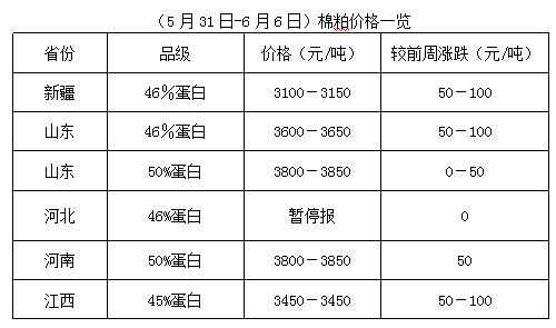 上周,豆粕期貨周一至周四低位震蕩反彈,周五滯漲回落,較上周五略漲?,F(xiàn)貨震蕩調(diào)整。周末沿海地區(qū)43%蛋白豆粕價(jià)3460-3600元/噸,較前周(5月24-28日)上調(diào)40-60元/噸。棉籽價(jià)格高位再?zèng)_,油棉廠停收現(xiàn)象增加,開工率下降,棉粕供應(yīng)不足,廠家對棉粕持價(jià)出貨,個(gè)別報(bào)價(jià)持續(xù)上漲。但目前棉粕價(jià)格與豆粕多已形成倒掛,市場需求受到一定限制。但因目前棉粕蛋白含量多為46%以上,與43%蛋白豆粕相比仍有一定優(yōu)勢,特別是水產(chǎn)養(yǎng)殖需料,目前正值大量投放期,或?qū)γ奁尚纬梢欢ㄖ巍P伦焉鲜星?,棉粕貨少?yōu)勢明顯,參照豆粕走勢前提下,棉粕易漲難跌之勢仍難改變。