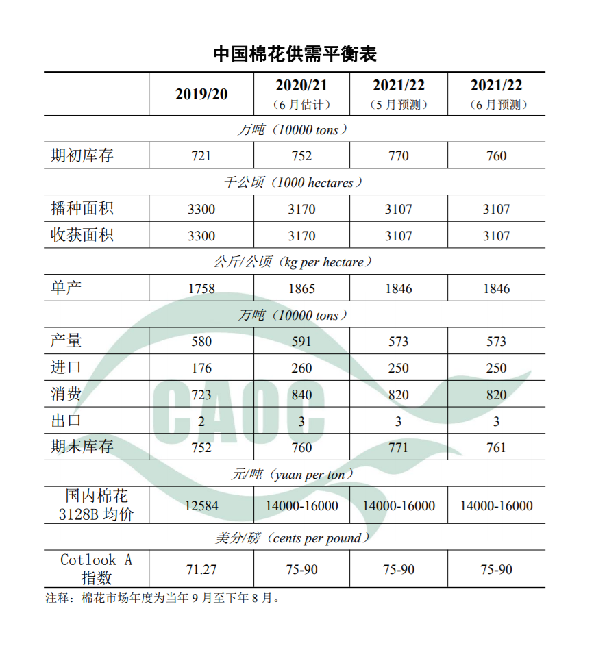 本月估計,2020/21年度紡織品服裝出口形勢向好,企業(yè)訂單好于預(yù)期,消費量調(diào)增30萬噸至840萬噸,進口上調(diào)20萬噸至260萬噸,期末庫存降至760萬噸。本月預(yù)測,全國棉花生長氣象條件較適宜,好于近五年平均水平,2021/22年度棉花播種面積、產(chǎn)量和消費量維持上月不變。