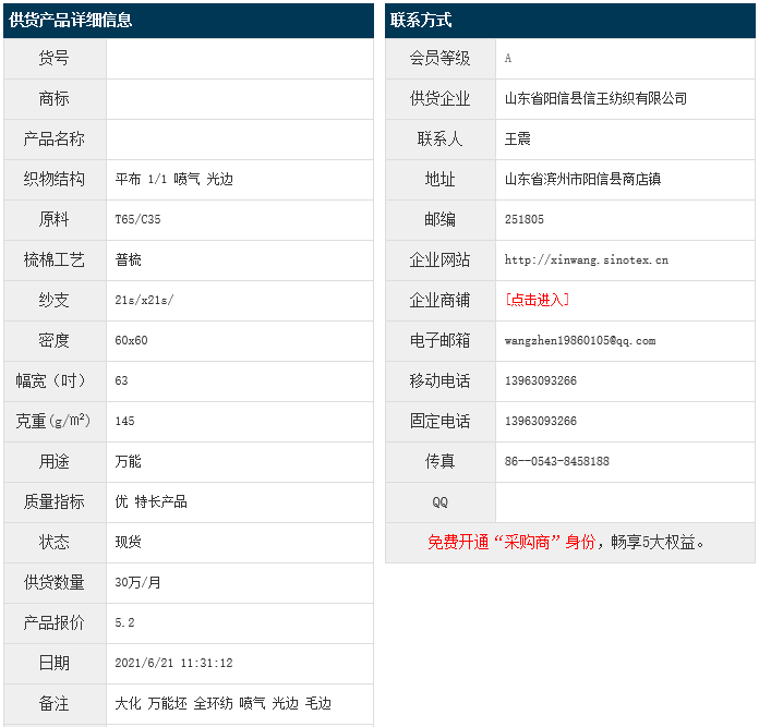 6月21日,山東陽信縣信王紡織有限公司滌棉平布T65/C35 21x21 60x60 63" 1/1 145g/㎡ 噴氣 光邊,報價為5.2元/米,實際成交價以協(xié)商為準。[點擊查看詳情]