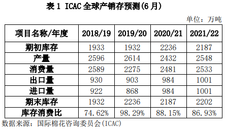 國際棉花咨詢委員會(ICAC)首次發(fā)布2021/22年度全球棉花產(chǎn)銷存預(yù)測數(shù)據(jù),2021/22年度全球棉花產(chǎn)量2548萬噸,同比增加116萬噸,增幅4.77%;消費量2533噸,同比增加52萬噸,增幅2.1%;期末庫存2202萬噸,同比增加15萬噸,增幅0.69%;全球產(chǎn)需狀況由2020/21年度的產(chǎn)不足需49萬噸轉(zhuǎn)變?yōu)?021/22年度的產(chǎn)大于需15萬噸;2021/22年度全球庫存消費比為86.93%,較2021/22年的88.15%下降1.22個百分點。
