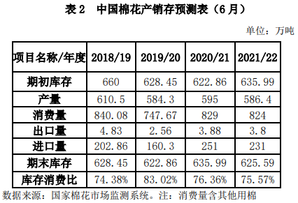 基于相關(guān)專題調(diào)查和對國內(nèi)外經(jīng)濟環(huán)境及市場狀況的分析,2021年6月國家棉花市場監(jiān)測系統(tǒng)對2021/22年度國內(nèi)棉花產(chǎn)銷存預(yù)測如下:2021/22年度我國棉花產(chǎn)量586.4萬噸,同比減少8.6萬噸,減幅1.45%;消費量824萬噸,同比減少5萬噸,減幅0.6%;期末庫存625.59萬噸,同比減少10.4萬噸,減幅1.64%;產(chǎn)需缺口237.6萬噸,較2020/21年度擴大3.6萬噸,庫存消費比為75.57%,較2020/21年度下降0.79個百分點。