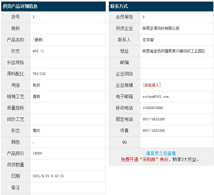 6月23日,陜西芷源紡織有限公司滌棉紗T65/C35 45S,報(bào)價(jià)為18000元/噸,實(shí)際成交價(jià)以協(xié)商為準(zhǔn)。[點(diǎn)擊查看詳情]
