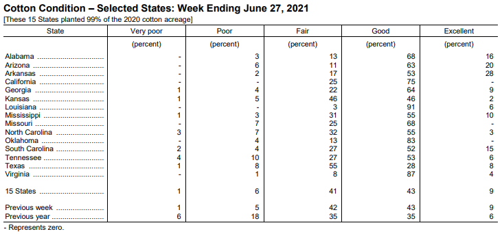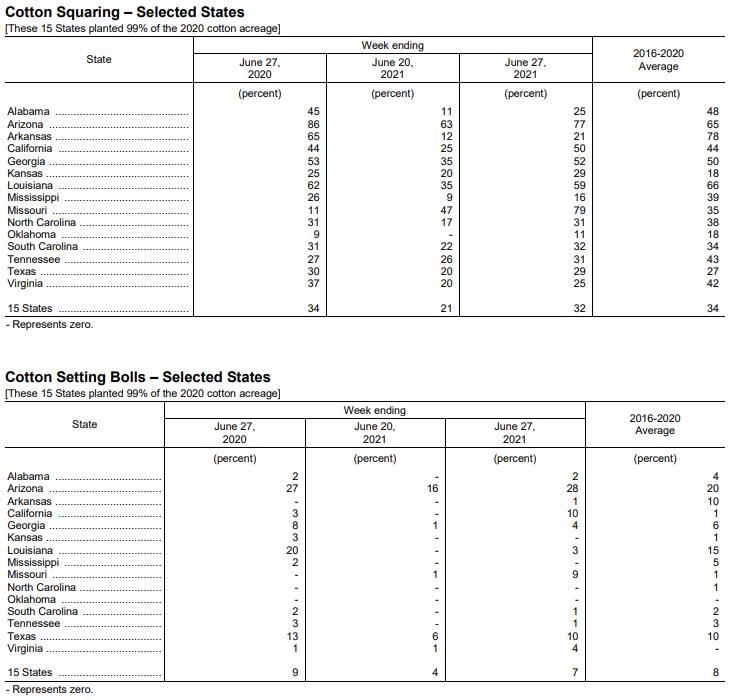 美國農(nóng)業(yè)部6月28日發(fā)布的美國棉花生長報告顯示,截至6月27日當周,美棉現(xiàn)蕾率為32%,前周為21%,去年同期為34%,五年均值為34%。美棉結(jié)鈴率為7%,前周為4%,去年同期為9%,五年均值為8%。美棉生長優(yōu)良率為52%,前周為52%,去年同期為41%。