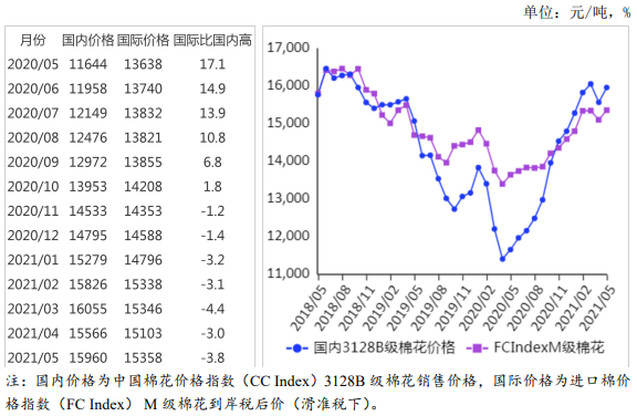 (一)國內(nèi)棉價環(huán)比上漲。5月,印度疫情爆發(fā)導(dǎo)致部分訂單回流國內(nèi),我國1季度經(jīng)濟(jì)數(shù)據(jù)好于預(yù)期,紡織企業(yè)原料采購積極性較高,國內(nèi)棉價環(huán)比上漲。據(jù)《中國棉花工業(yè)庫存調(diào)查報告》數(shù)據(jù),5月初,準(zhǔn)備采購棉花的企業(yè)占69.6%,環(huán)比增11.7個百分點(diǎn),同比增19.6個百分點(diǎn)。5月,國內(nèi)3128B級棉花月均價每噸15960元,環(huán)比漲2.5%,同比漲37.1%。鄭棉期貨主力合約(CF109)月結(jié)算價每噸15780元,環(huán)比漲3.5%,同比漲37.0%。