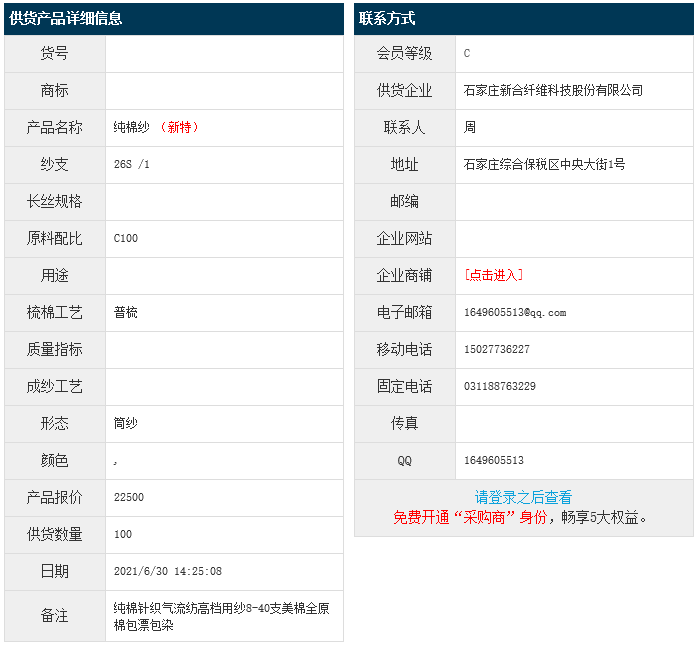 6月30日,石家莊新合纖維科技股份有限公司純棉紗C100 26S,報價為22500元/噸,實際成交價以協(xié)商為準(zhǔn)。[點(diǎn)擊查看詳情]