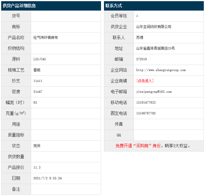 7月2日,山東圣潤紡織有限公司麻棉布L55/C45 11(OE)x11 51x47 63",報價為11.3元/米,實際成交價以協(xié)商為準。[點擊查看詳情]