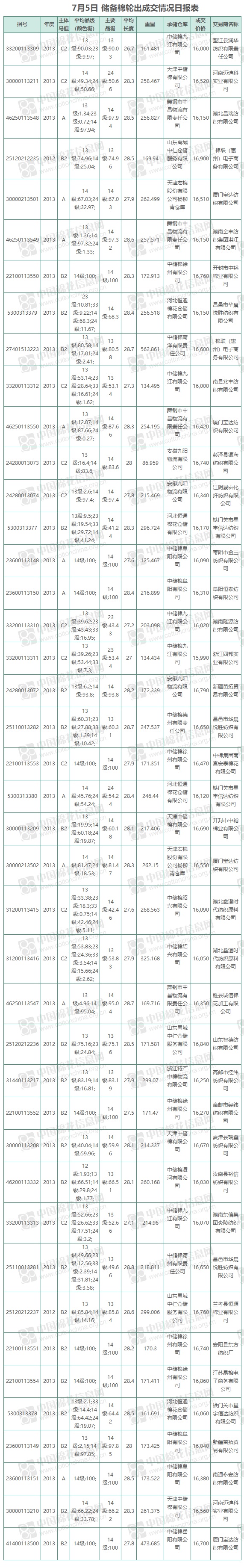 7月5日儲(chǔ)備棉輪出銷售資源9542.299噸,實(shí)際成交9542.299噸,成交率100%,成交均價(jià)16400元/噸,折3128價(jià)格17718元/噸,成交最高價(jià)16900元/噸,最低價(jià)15990元/噸。