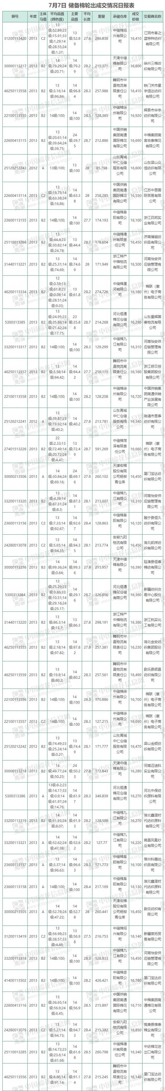 7月7日儲(chǔ)備棉輪出銷售資源9540.873噸,實(shí)際成交9540.873噸,成交率100%,成交均價(jià)16427元/噸,較6日下跌28元/噸,折3128價(jià)格17786元/噸,較6日下跌16元/噸,成交最高價(jià)16920元/噸,最低價(jià)16100元/噸。