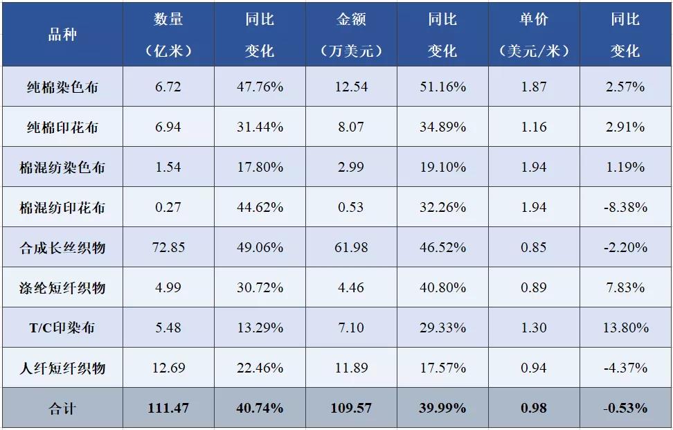 表3 2021年1-5月印染八大類產品出口情況