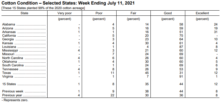 美國(guó)農(nóng)業(yè)部7月12日發(fā)布的美國(guó)棉花生長(zhǎng)報(bào)告顯示,截至7月11日當(dāng)周,美棉現(xiàn)蕾率為55%,前周為42%,去年同期為61%,五年均值為61%。美棉結(jié)鈴率為16%,前周為11%,去年同期為17%,五年均值為20%。美棉生長(zhǎng)優(yōu)良率為56%,前周為52%,去年同期為44%。