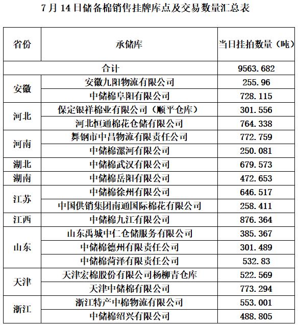 中國儲備棉管理有限公司定于7月14日上市銷售儲備棉重量9563.682噸,共43捆,其中新疆棉6559.46噸。