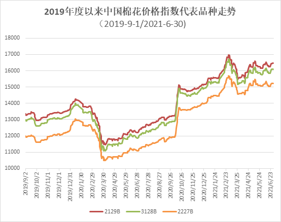 6月,受大宗商品市場走勢影響,國內(nèi)棉價上旬維持漲勢,中下旬保持震蕩。紡織企業(yè)開工率較高,原料庫存有所下降,對棉花需求依舊較好。月底,中國棉花價格指數(shù)(CCIndex3128B)16097元/噸,環(huán)比上漲337元;月均價15985元/噸,環(huán)比上漲35元,同比上漲4027元/噸。