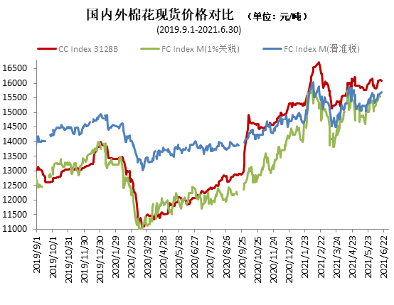 6月,國際棉花期、現(xiàn)貨價格總體上漲,中國進口棉價格指數(shù)FCIndexM月均96.34美分/磅,環(huán)比上漲2.3美分;月底98.37美分/磅,環(huán)比上漲5.98美分,1%關(guān)稅下折人民幣15541元/噸,低于同期國內(nèi)現(xiàn)貨556元,內(nèi)外棉價差較上月末縮小418元。