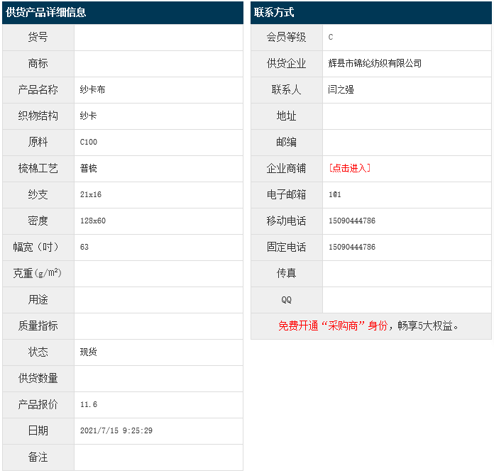 7月15日,輝縣錦綸紡織有限公司純棉紗卡C100 21x16 128x60 63",報(bào)價(jià)為11.6元/米,實(shí)際成交價(jià)以協(xié)商為準(zhǔn)。[點(diǎn)擊查看詳情]